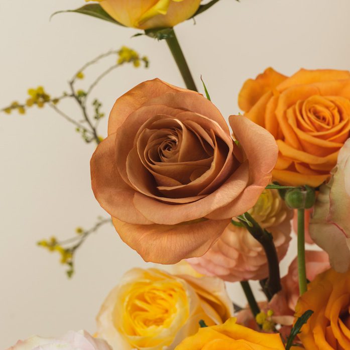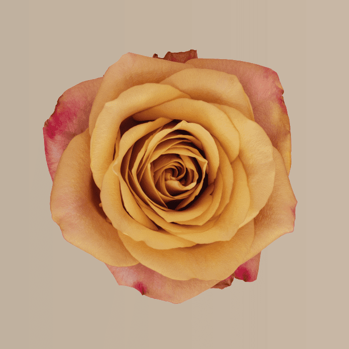 Symbol rose commands attention with its striking appearance, boasting richly colored blooms of dark tan yellow accented by edges dipped in dark, earthy pink, adding depth to its color. As it opens completely, this rose takes on a new dimension, becoming even more beautiful. Its long-lasting, warm, and amber tea blooms open widely, maintaining its shape with tightly furled petals at the center and graceful curves along the edges, enhancing its allure and beauty.